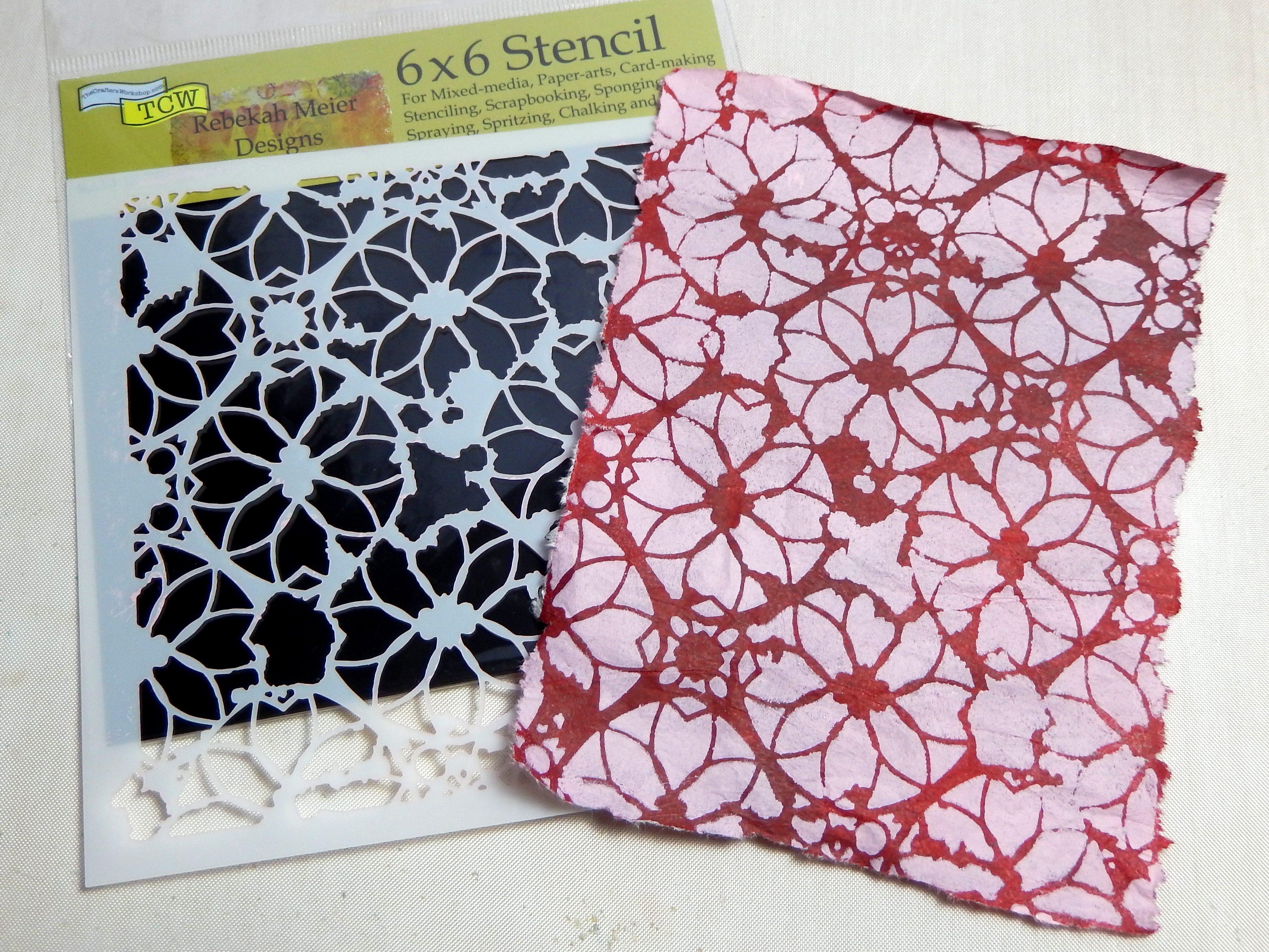 Another of Rebekah Meier's stencils 'Distressed Lace' was used in conjunction with pink paint to alter some of the red tissue. Again you could use coordinating pieces of patterned paper if you'd prefer.